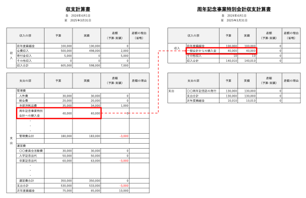 ここでは「周年記念事業特別会計」という特別会計を設置し、一般会計と分けて収支計算書を作成しています。一般会計側では「周年記念事業特別会計への繰入金」という支出用の勘定科目を作り、4万円を支出しています。これに対し特別会計側では「一般会計からの繰入金」という収入用の勘定科目を作り、4万円の収入としています。