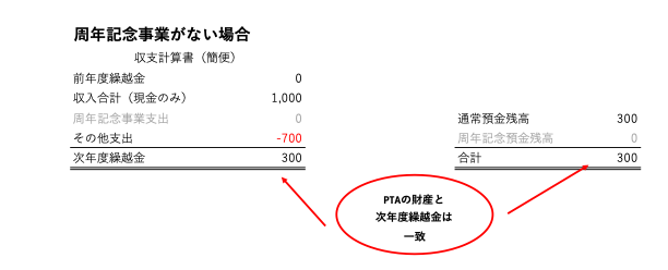 まずは周年記念事業がない場合を見てみましょう。この場合には次年度繰越金とPTAの財産(資金残高)が一致しています。