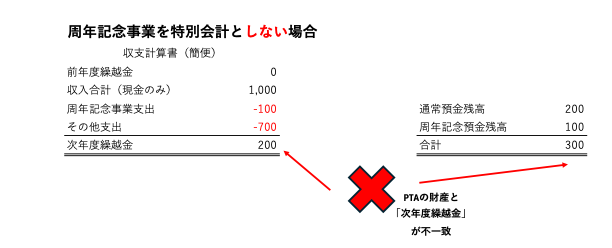 次に周年記念事業支出が100生じるとどうなるでしょうか。この支出は通常預金から周年記念預金に移されるものとします。この場合、PTAの財産は通常預金(200)と周年記念預金(100)を合わせた300あるはずですが、次年度繰越金は200となっており、PTAの財産と次年度繰越金が一致していません。これを会員に報告しても、会員はPTAの財産を正しく理解することができません*7。この原因は、周年記念預金が収支会計の外に行ってしまった、いわゆる「簿外」(帳簿外)となったことにあります。